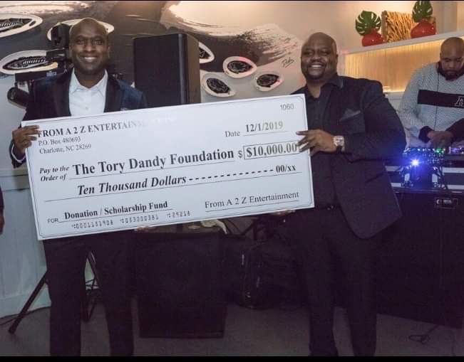The Tory Dandy Foundation receives a $10,000 donation to support scholarships for students. Pictured right are Tory Dandy, Founder of the Tory Dandy Foundation and Executive at CAA Sports along with Dre Brown, owner of From A 2 Z Entertainment.