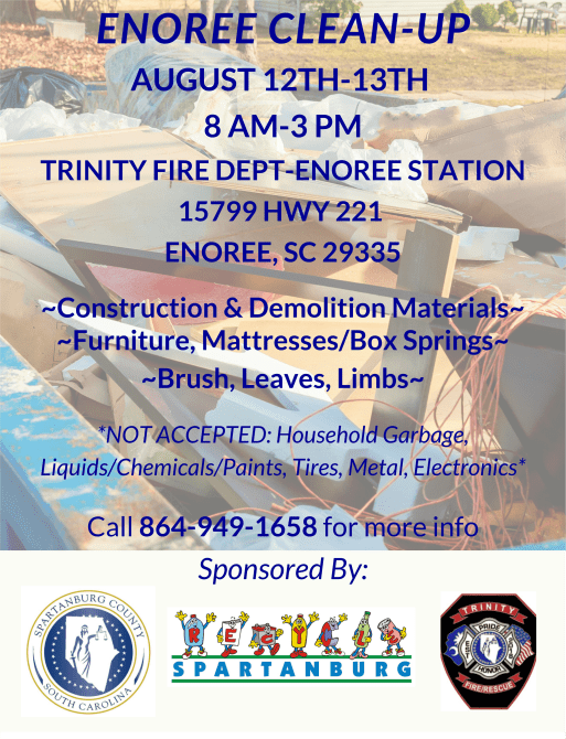 Per Jes Sdao, Recycling Coordinator for Spartanburg County, a community clean-up is planned for August 12th-13th from 8 a.m. -3 p.m. in Enoree. Sdao says, “… we feel that having an event in Enoree serves a vital need for the community”.