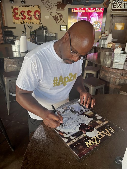 Ben Harrison, the owner of Tap Three, honored the achievements of Coach Jones by displaying some of Coach Jones’ memorabilia on the walls of Tap Three. Pictured in the photo below is an autographed Ole Miss helmet, a framed copy of Derek wearing an Ole Miss jersey #38, and a framed autographed cover of Derek’s book, Ap2w, Always Play to Win.