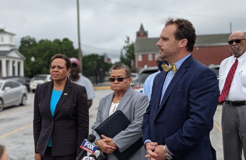 From left, attorney Roslyn Henderson-Myers, Rev. Catherine Cullen Evans and attorney Mark Peper, Sr. speak during Tuesday’s press conference at the Laurens County Sheriff’s Office.