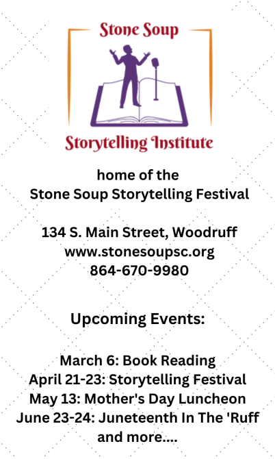 Other events happening at MUSE 134, 134 South Main Street in downtown Woodruff include April 21-23- the 2023 Stone Soup Storytelling Festival.