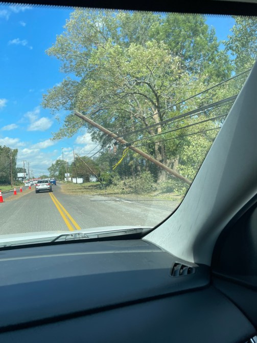 Photo courtesy of Mandy May, Power poles falling on Main St, blocking lanes