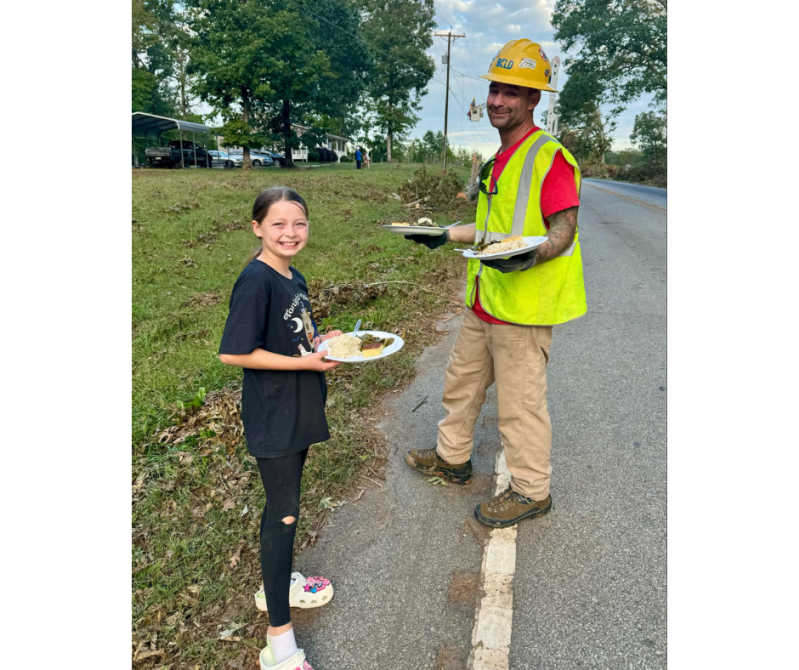 Photo courtesy of Cindy Zrowka, daughter giving food to hardworking lineman