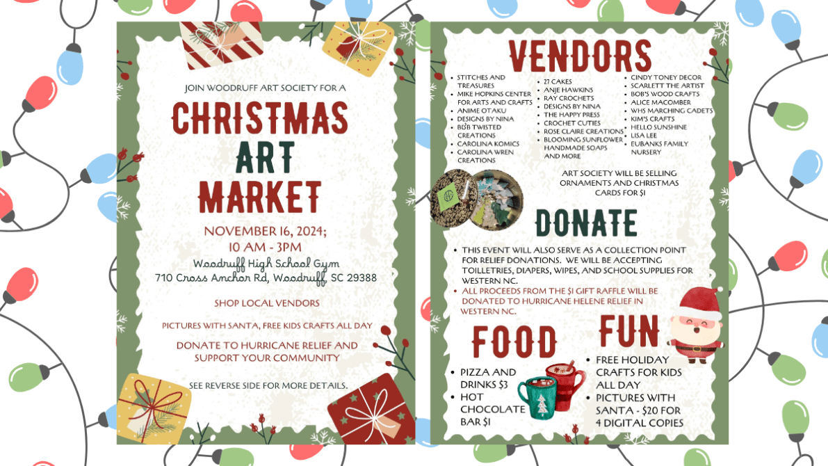 With holiday shopping, community support, and festive family activities, the Christmas Art Market is shaping up to be a special day for Woodruff. Join in on November 16 to kick off the holiday season with joy, creativity, and a spirit of giving.