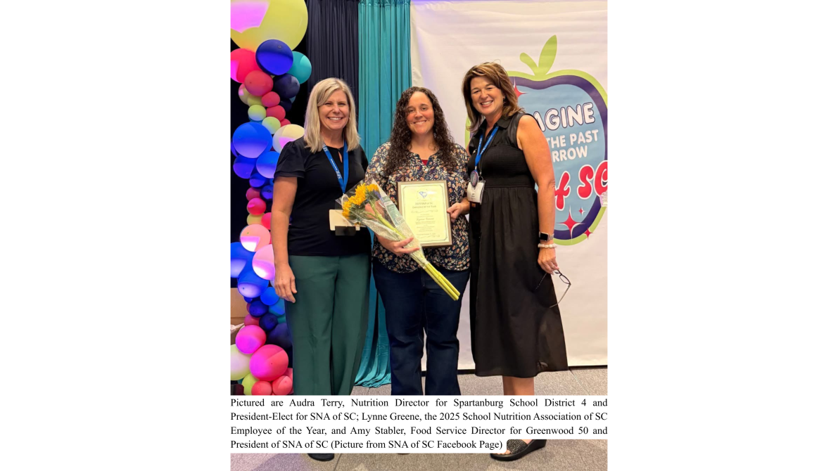 “Lynne exemplifies what it means to serve with heart,” said Audra Terry, Nutrition Director for Spartanburg School District Four and president elect for SNA of SC. “Her energy and dedication inspire both students and staff.”