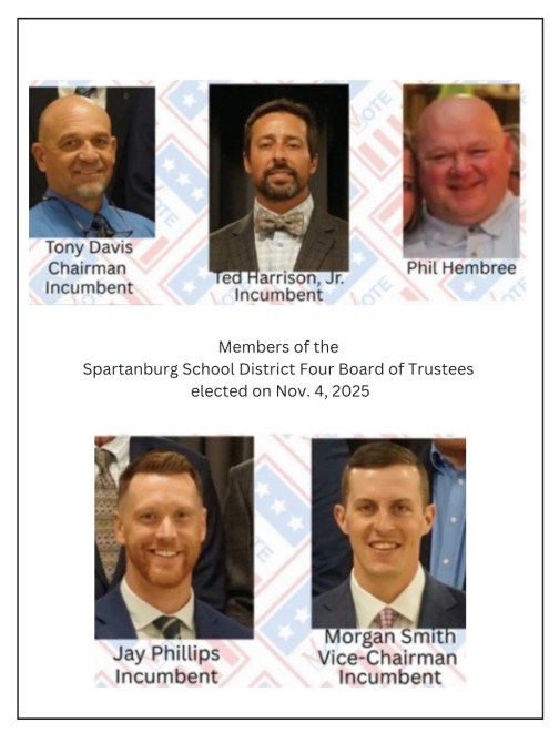 The newly elected trustees will be sworn in at the upcoming organizational meeting later this month, where board officers will also be determined. As Spartanburg School District Four continues to experience growth and change, the board’s blend of experience and new perspective positions it to lead the district confidently into the future.
