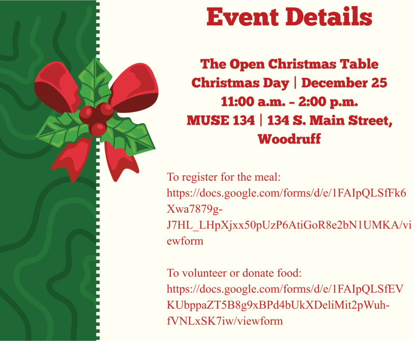 On Christmas Day, December 25, from 11 a.m. to 2 p.m., Stone Soup Storytelling, in partnership with MUSE 134, will host The Open Christmas Table Woodruff, a community meal and fellowship designed especially for those who may be widowed, newly relocated, estranged from family, elderly, single parents, or simply without a place to go on Christmas Day.