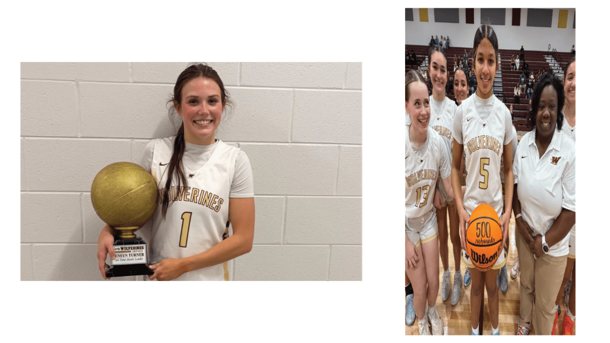 Following Monday’s home basketball game against Mountain View Prep, Jensyn Turner and Jasmine McKnight were recognized for significant career accomplishments. Turner became the Lady Wolverines’ all-time career steals leader two weeks ago, while McKnight surpassed 500 rebounds for her career, in a season when she is averaging over 11 boards per game. Both ladies were presented with commemorative basketballs to mark the occasion.