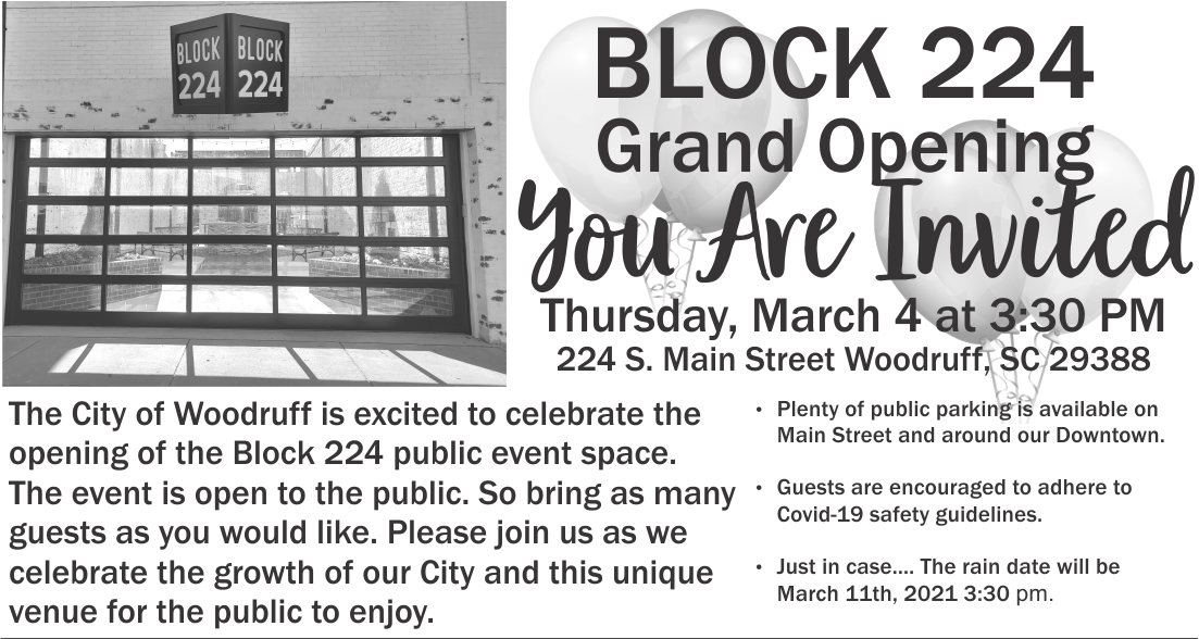 The City of Woodruff is excited to celebrate the opening of the Block 224 public event space. The event is open to the public. So bring as many guests as you would like. Please join us as we celebrate the growth of our City and this unique venue for the public to enjoy.