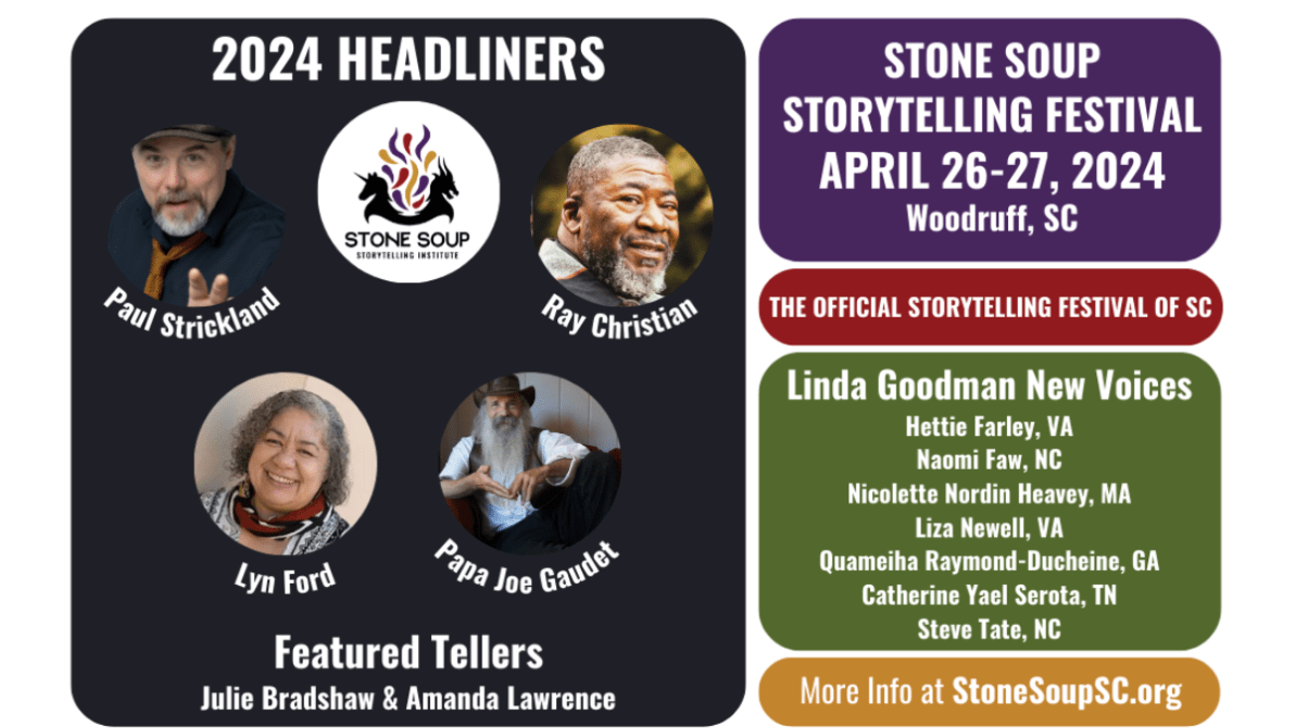 10:30 am — Tales from the Tellers: [Woodruff Library — 270 E Hayne St, Woodruff] Festival Headliners Papa Joe Gaudet and Lyn Ford will tell fairytales, folktales, fables, and other stories more suited to a younger audience. Lyn and Papa Joe’s stories will be a sure-fire hit with the “12 and under” crowd. This is a free event. NOTE: Children should be accompanied by a parent or adult guardian during this event. This event will be finished by noon.