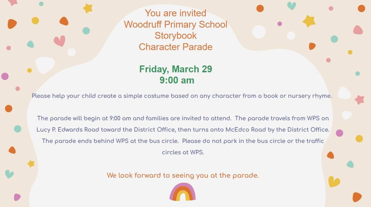 Story Book Character Parade Tracy Sanders 2 years ago Advertisements Woodruff Primary School invites you to the annual Storybook Character Parade! Share this: Click to share on Facebook (Opens in new window) Facebook Click to share on LinkedIn (Opens in new window) LinkedIn More Click to print (Opens in new window) Print Click to share on Reddit (Opens in new window) Reddit Click to share on X (Opens in new window) X Click to share on Tumblr (Opens in new window) Tumblr Click to share on Pinterest (Opens in new window) Pinterest Click to share on WhatsApp (Opens in new window) WhatsApp Click to email a link to a friend (Opens in new window) Email WOODRUFF LIBRARY: Woodruff Readers Book DiscussionsWOODRUFF LIBRARY: Evening Edition Book Discussion7th Annual Car Show (Helping Hands Ministries of Woodruff)